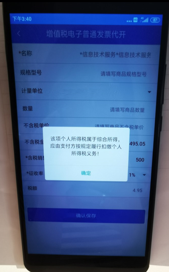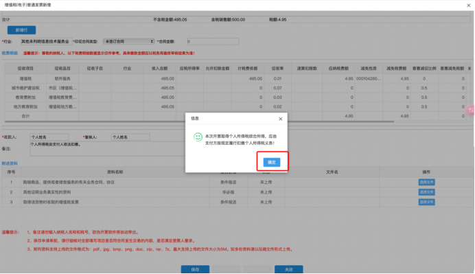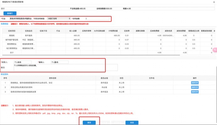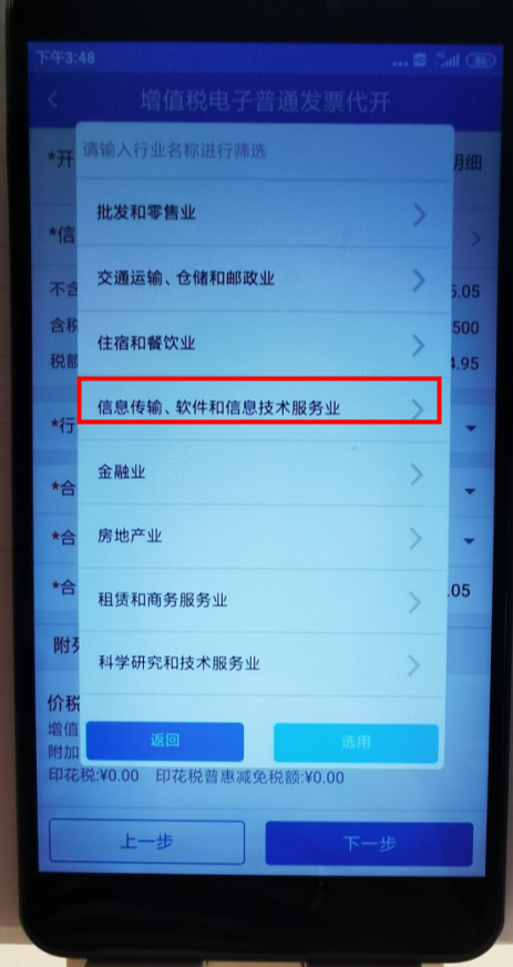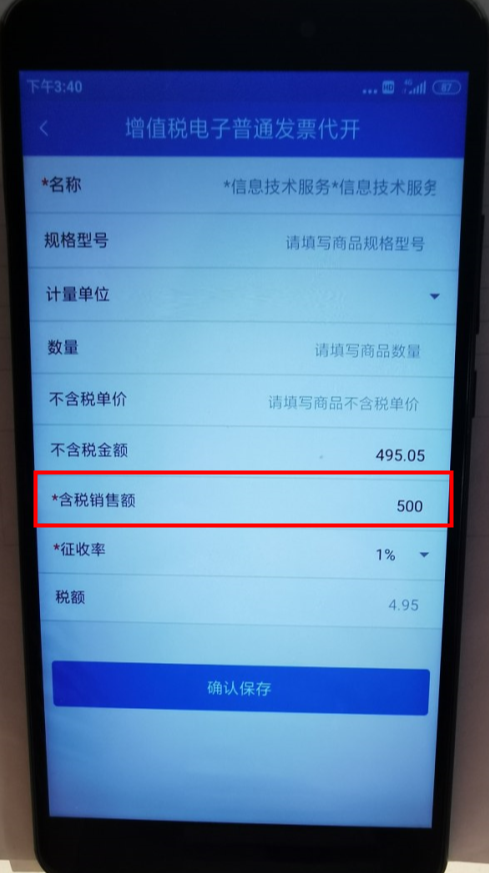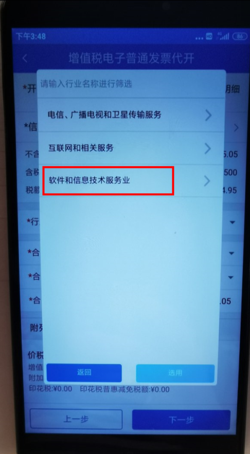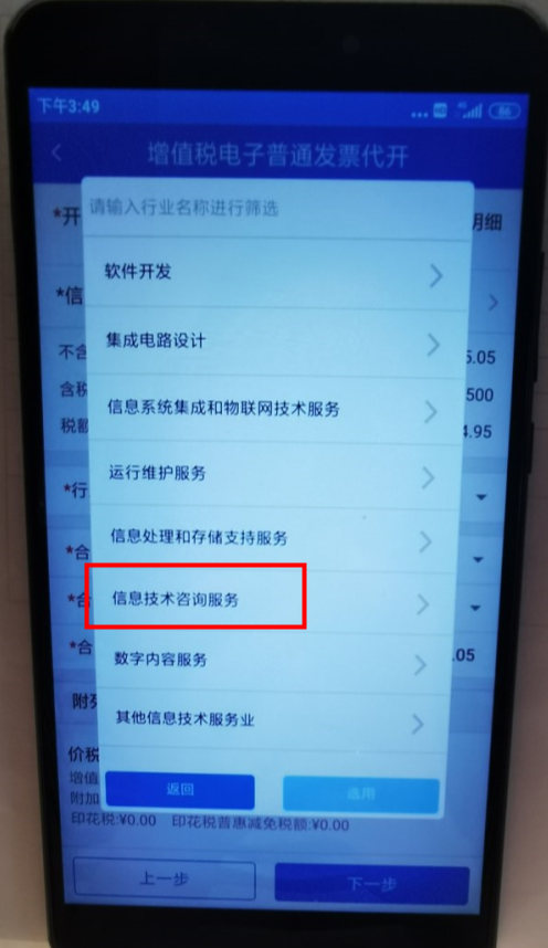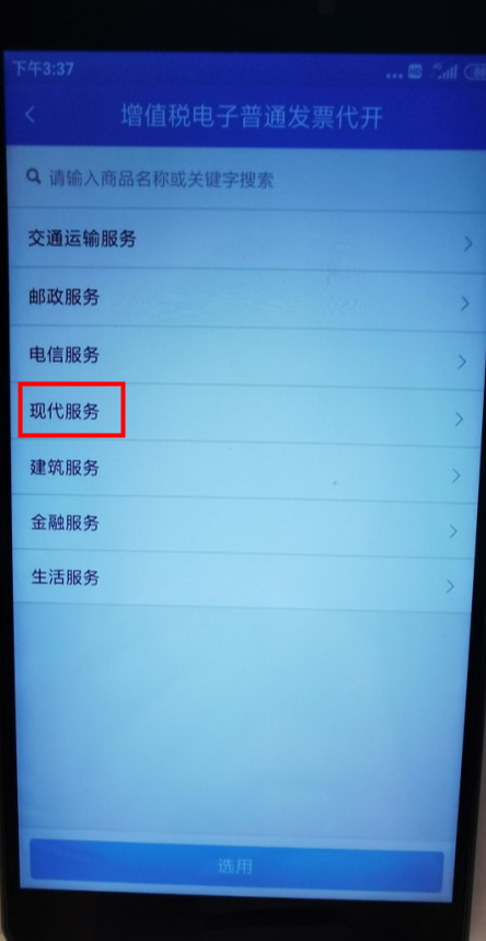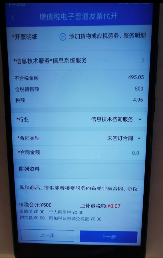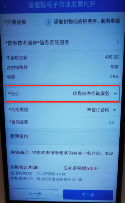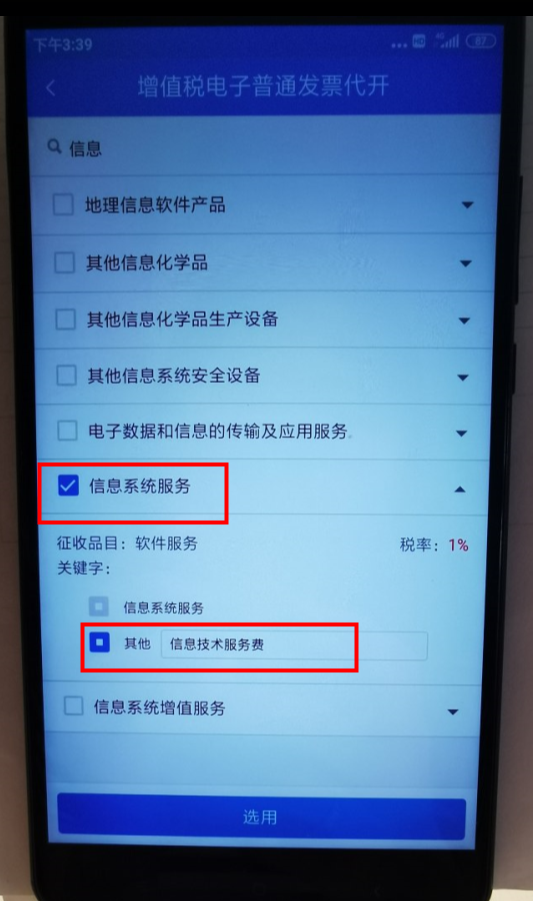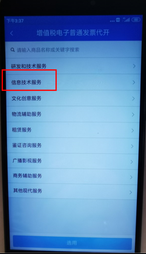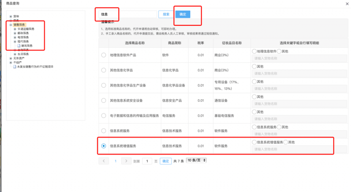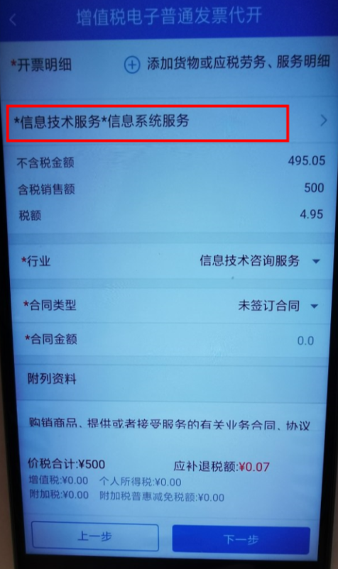 5.1 选择开票明细:选择销售服务→现代服务→信息技术服务或者(搜索“信息系统服务”→选择“信息系统服务--其他”→填写“信息技术服务”)→填含税金额(比如500元)。
