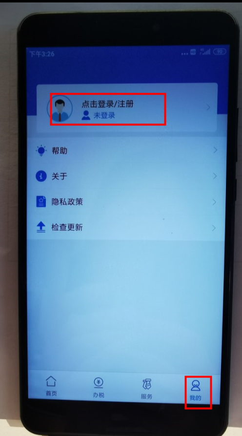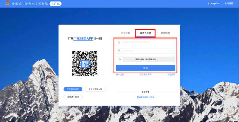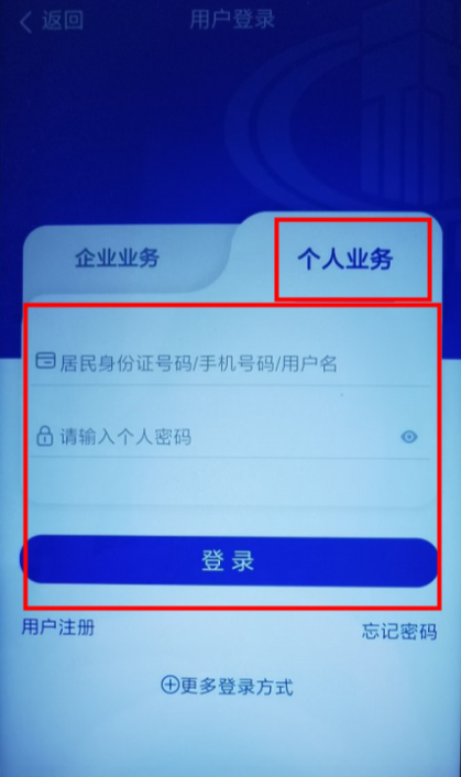 2.安装后打开“广东税务”APP,点击右下角“我的”,点击登录/注册,选择“个人业务”输入账号密码。如下图所示: