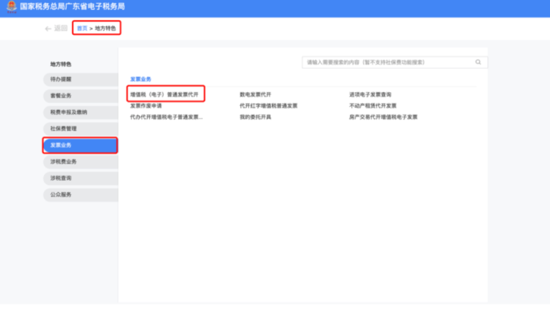 2.点击【地方特色】→【发票业务】,选择“增值税(电子)普通发票代开”。如下图所示: