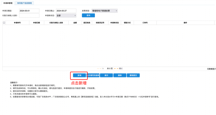 3.进入申请单管理页面,选择“新增”,填写代开发票的信息,业务发生地、街道、乡镇、领取方式,点击保存。如下图所示: