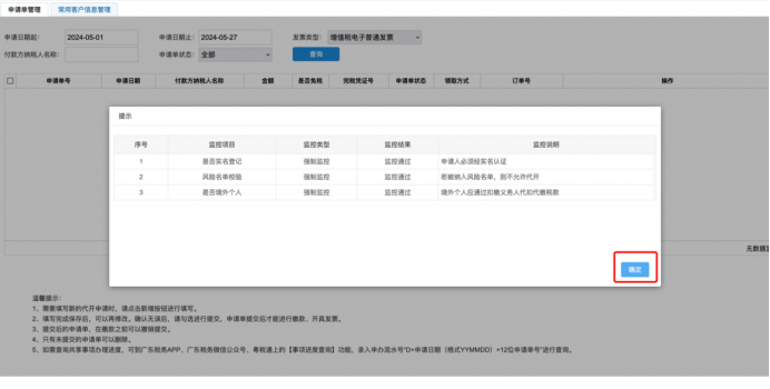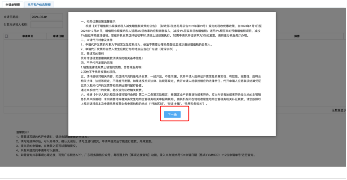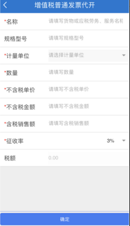 5.选择“下一步”后,填写发票相关内容,发票内容、数量、价格、税率等,确认无误后,点击确定提交,申请单提交后才能进行缴款、开具发票。如下图所示: