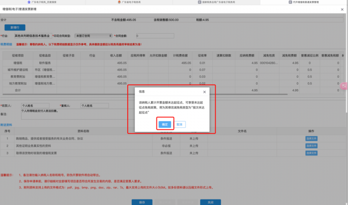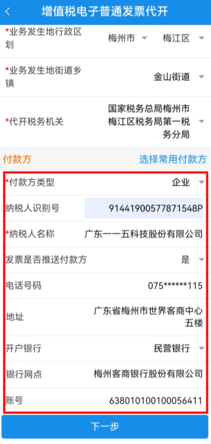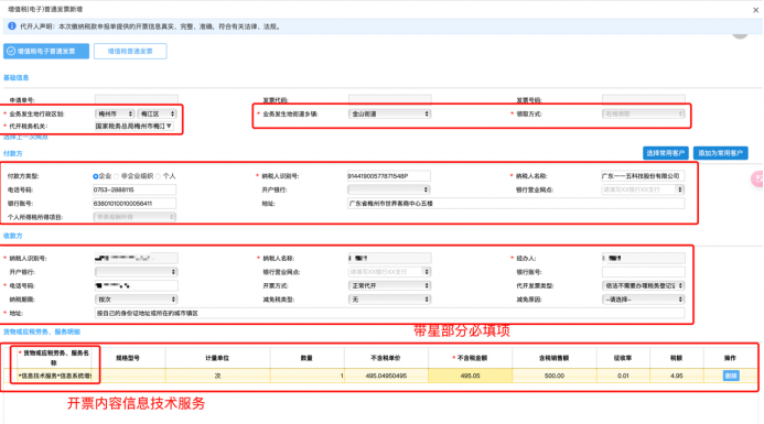 4.填写好代开发票的信息,业务发生地、街道、乡镇;付款方填对方公司资料(填好税号自动出来其他信息),收款方资料根据本人实名会自动出来。如下图所示: